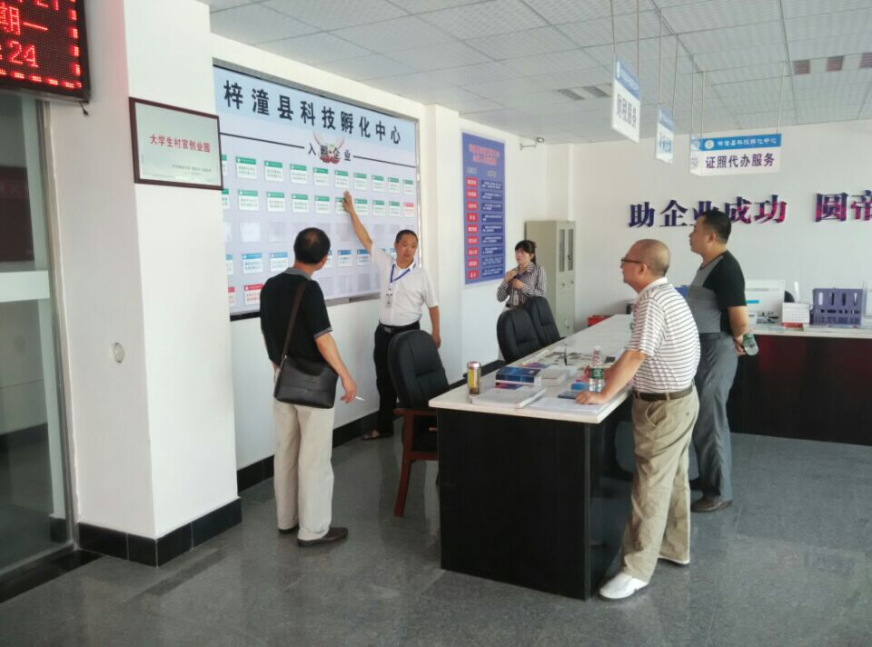 2015年7月27日上午,綿陽市梓潼縣發改商務局和工業商務局李建忠副局長、何江林副局長等有關領導到梓潼縣科技孵化中心大學生創業進行調研。綿陽市梓潼縣科技孵化中心楊旭靜經理全程接待陪同,并對孵化中心入孵的大學生創業企業進行了詳細的介紹。